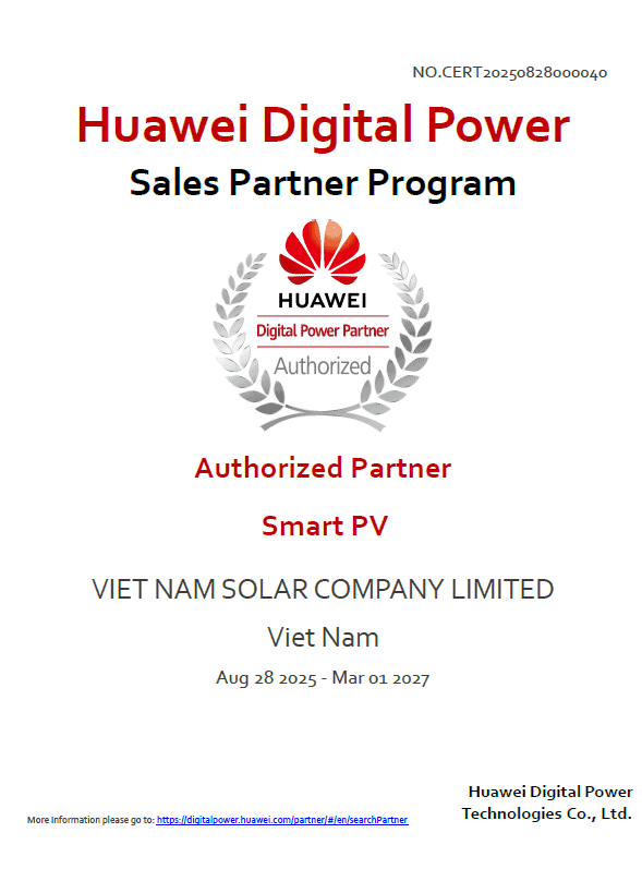 Việc được Huawei xác nhận giúp Việt Nam Solar củng cố vị thế trên thị trường, đồng thời tạo thêm niềm tin cho khách hàng khi lựa chọn các dòng inverter Huawei chính hãng. Đây cũng là cơ sở quan trọng để Việt Nam Solar tiếp tục mở rộng mạng lưới phân phối, dịch vụ kỹ thuật và hỗ trợ sau bán hàng trên toàn quốc.